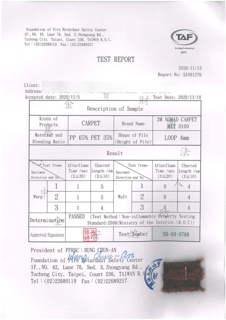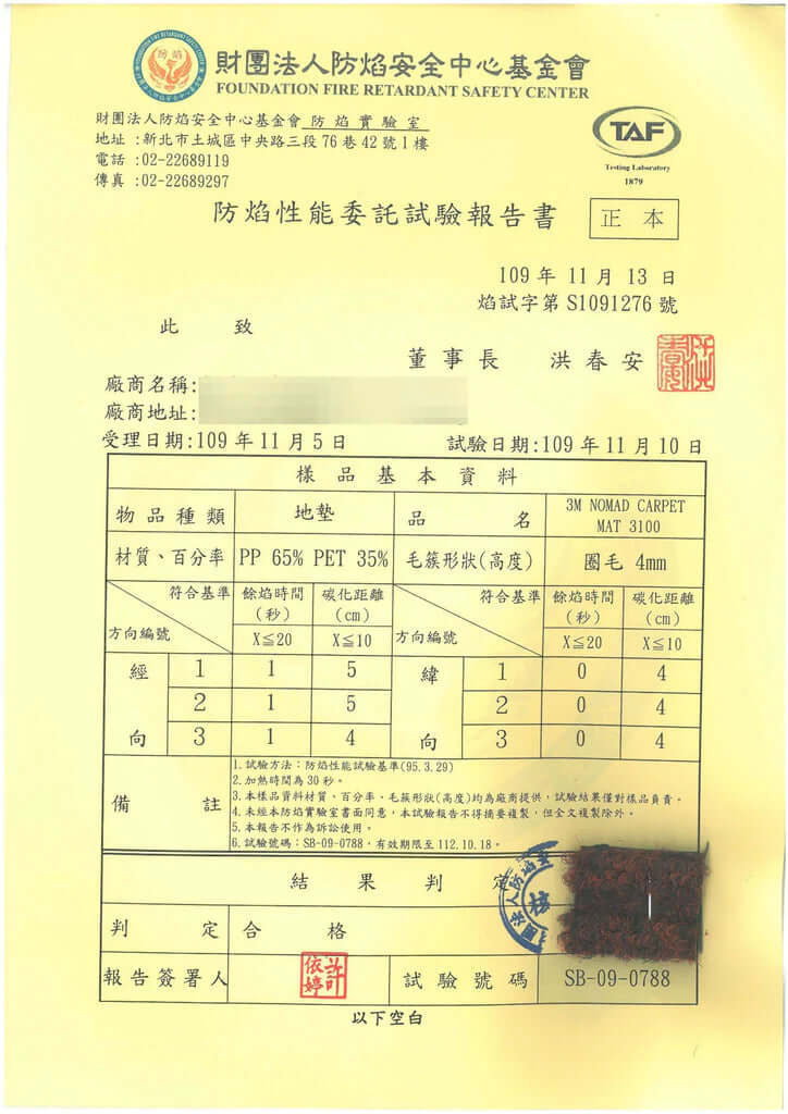 3M™地墊防焰證明